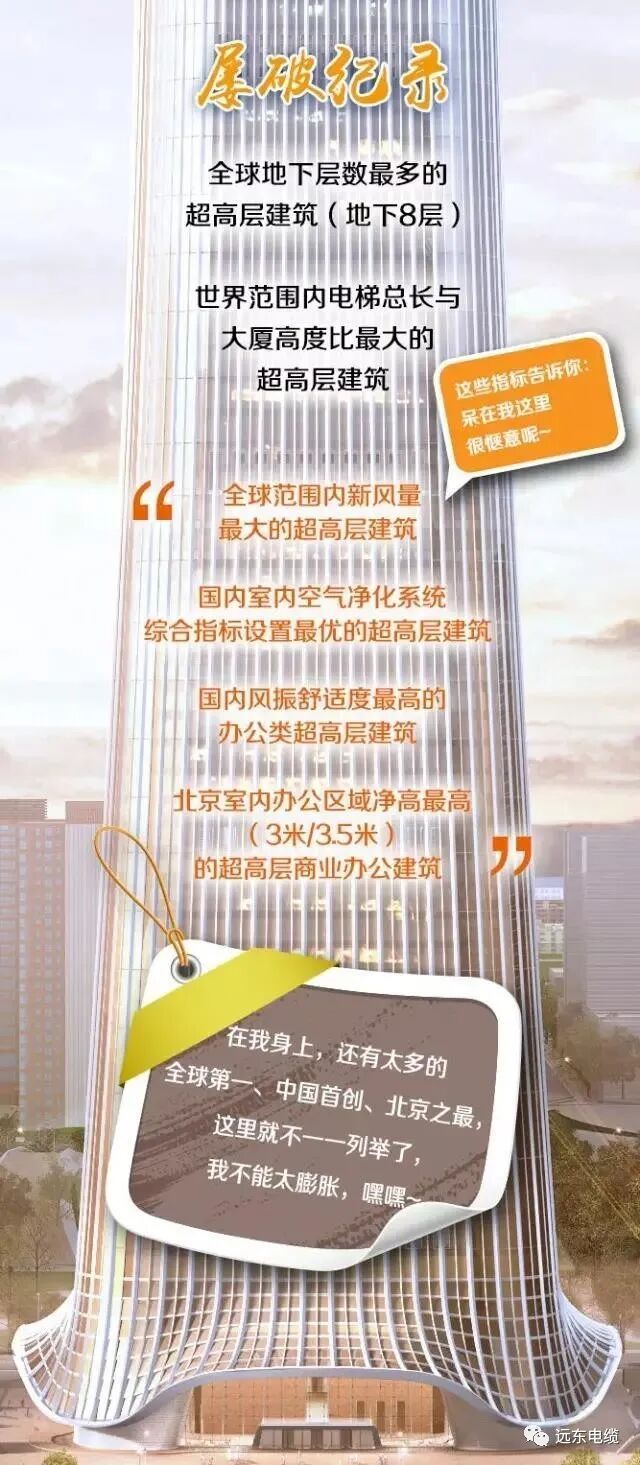 為此自2012年起,遠東電纜就開始跟進中國尊項目,與北京建筑設計院進行了多次探討,在詳細了解電纜敷設產品及技術要求的基礎上,開始為提供產品與系統設計方案進行周密籌備。2016年,隨著中國尊建設的穩步推進,遠東團隊開始設計施工方案,為了拿到第一手資料,多次進入到大廈施工現場,進行實地考察,針對大樓特殊的豎井結構,為其獨家設計了特殊10KV高壓懸垂電纜,堪稱“私人訂制”。